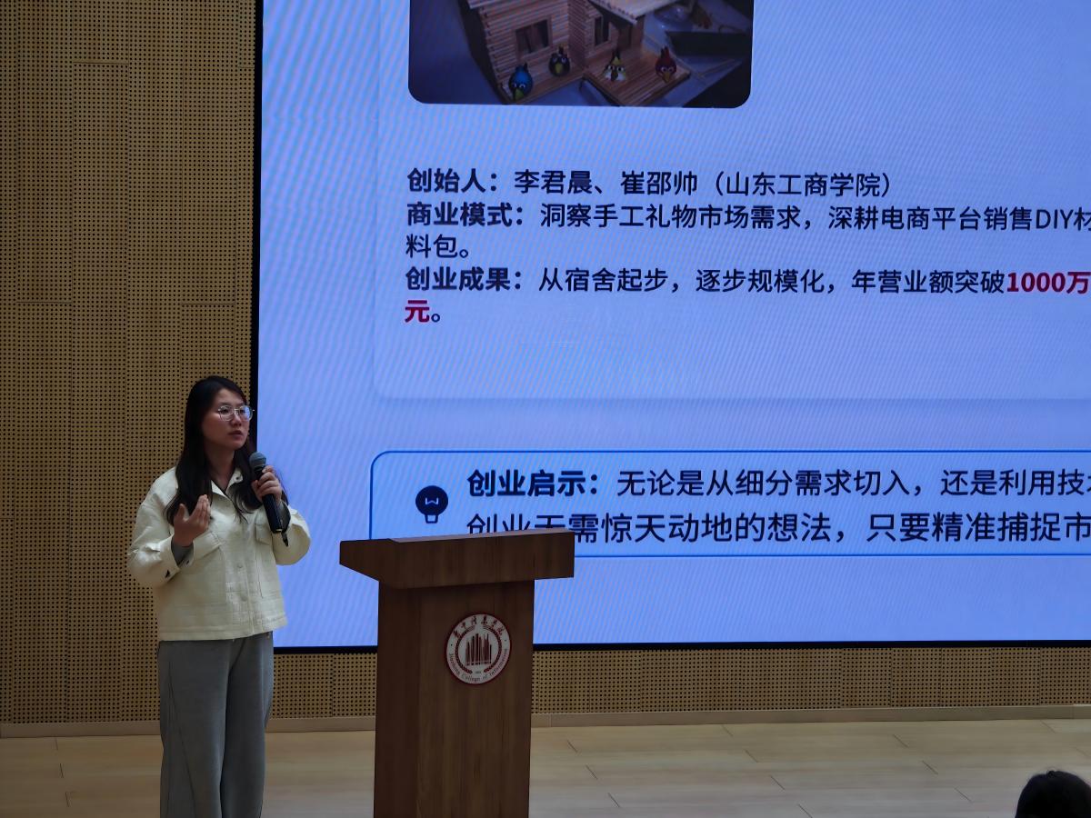 为让创业指导更具实操性,张老师结合多个大学生成功创业的典型案例,分享项目落地与运营的关键技巧。她以大学生DIY手工材料包、AI代运营服务商等贴合大学生创业特点的项目为例,深入分析其创意来源、市场定位、客群挖掘、运营模式及盈利逻辑,让同学们直观了解如何将创意转化为可落地、可持续的创业项目。同时,她重点提醒同学们,创业前期要做好充分的市场调研,精准把控行业痛点与用户需求;创业过程中要严控成本、规避风险,根据市场反馈及时调整项目方向,让创业之路走得更稳、更远。